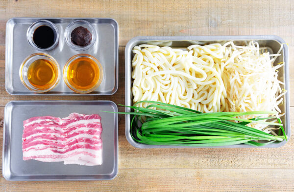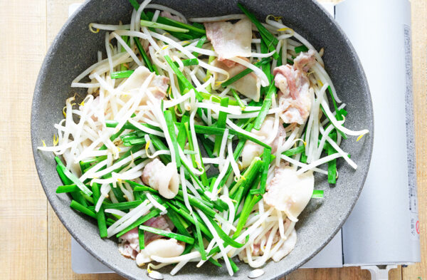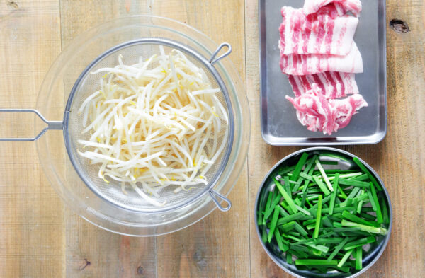 豚肉は食べやすい大きさに切る。ニラはざく切りにする。もやしは水にさらして水気を切る。