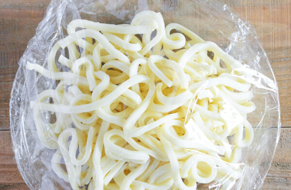うどんは電子レンジで加熱しておくと、ほぐれやすく短時間で味がなじみます。加熱時間はご家庭の電子レンジに合わせて調整してください。