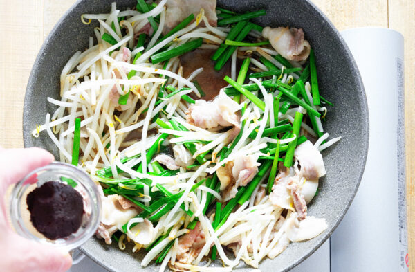フライパンにごま油(大さじ2)を熱し、豚肉、にら、もやしの順で加えながら中火で炒める。
