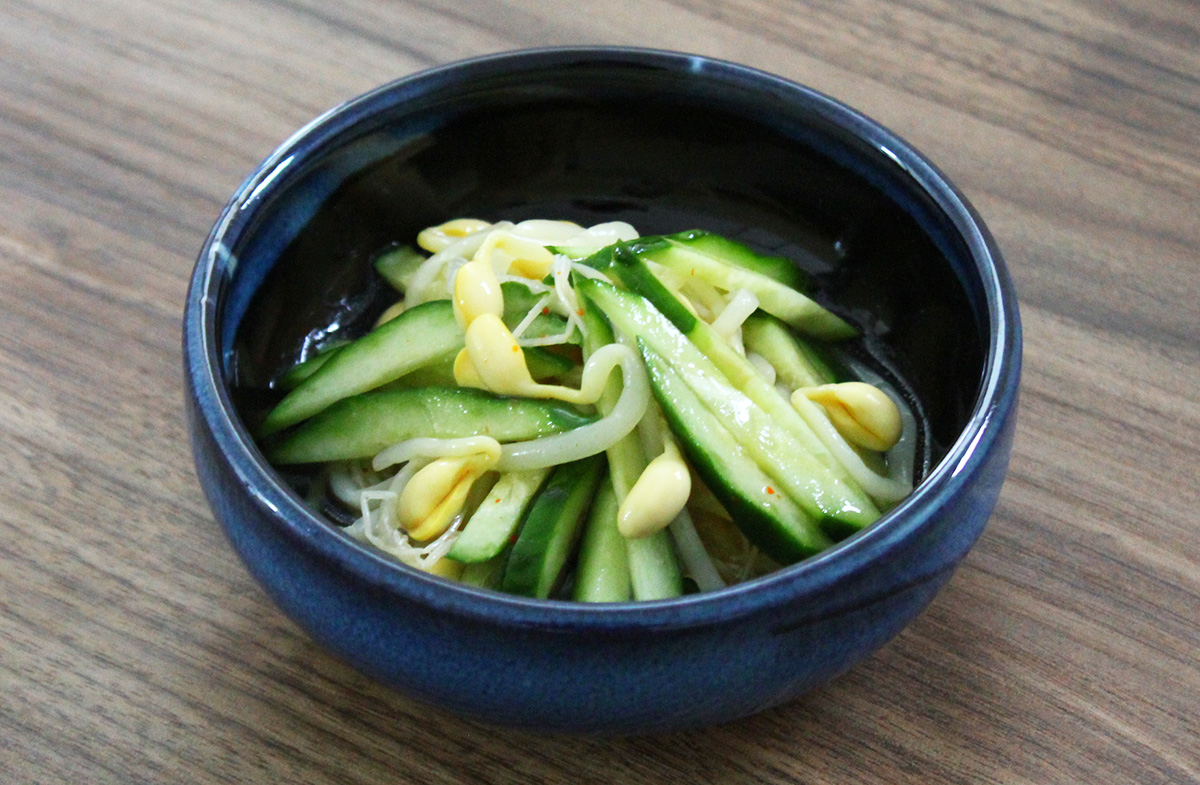 千切りきゅうりと和えるだけ!味付大豆もやしの調味液だけで味付けが完了するスピードメニュー♪