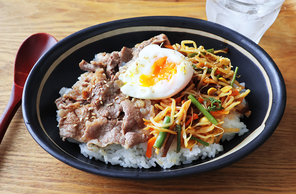 自社栽培の大豆もやしを使用した本格的で旨辛味のビビンバです。大豆もやし・人参・わらび・きくらげ・しいたけ入りです。