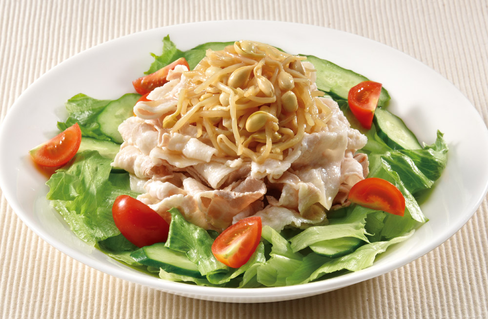 たっぷり野菜と豚肉で、暑い日にも栄養たっぷり 味付け大豆もやしのほどよい酸味で、ドレッシングいらずです。