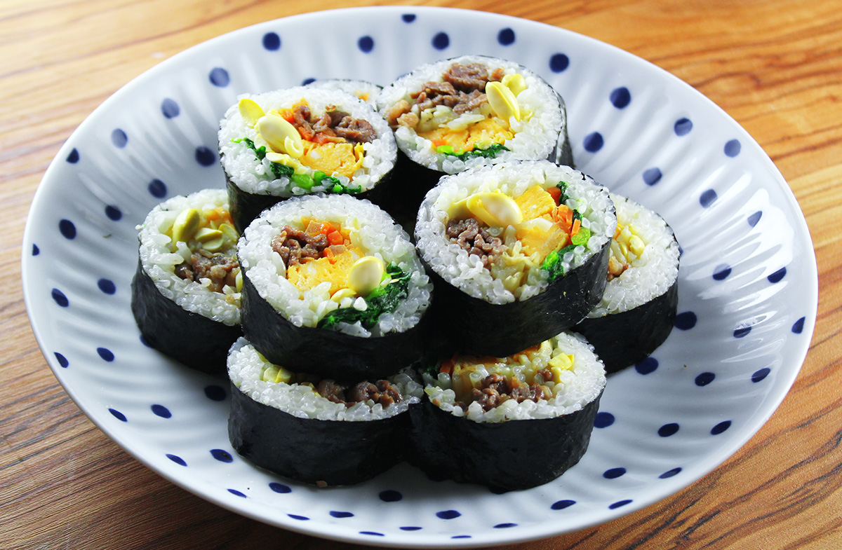 食べ応えのある韓国風巻き寿司のレシピです。味付け大豆もやしのシャキシャキ食感が良いアクセントになります。