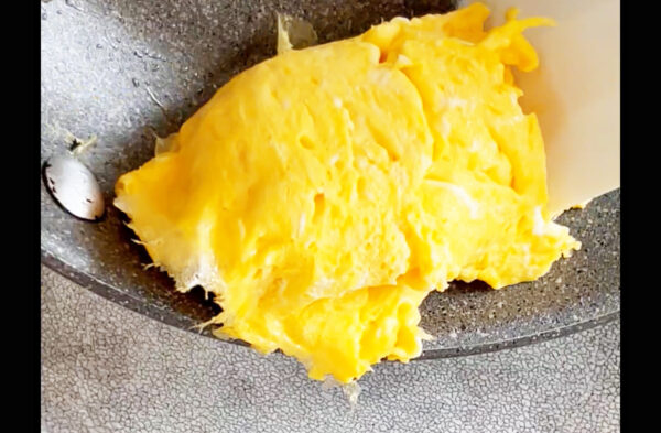 フライパンにごま油(大さじ1)を中火で熱し、溶き卵を入れて半熟で取り出す。