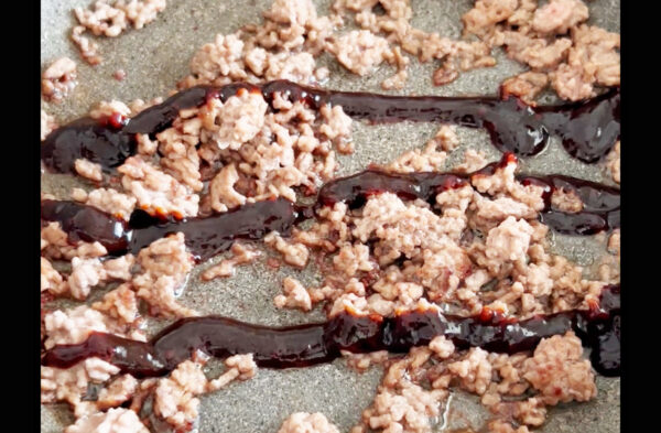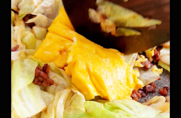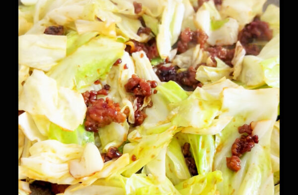 豚挽き肉の色が変わったらキャベツを加え、中火で全体を炒め合わせる。蓋をして弱火にし、2分を目安にキャベツがやわらかくなるまで蒸し焼きにする。