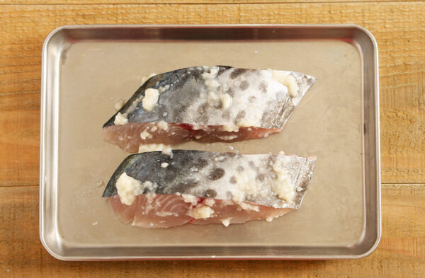 サワラに塩糀をなじませ、15分おいて水気を拭き取る。