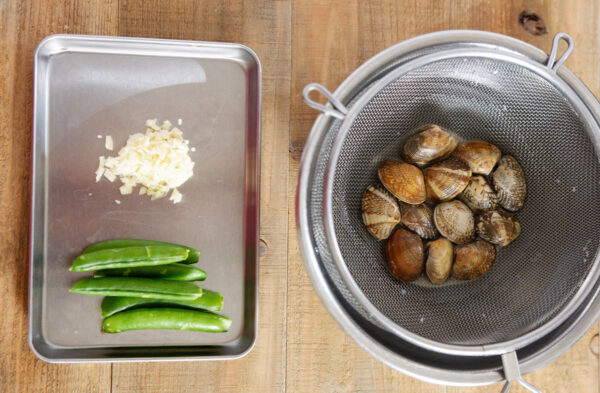 アサリは貝同士をこすって洗い、水気を切る。スナップエンドウは筋を取り、にんにくは芽を取ってみじん切りにする。