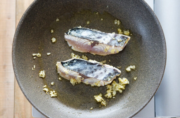 フライパンにオリーブオイル(大さじ1)、にんにくを入れて弱火で熱し、香りが立ったらサワラを加えて両面をサッと焼く。