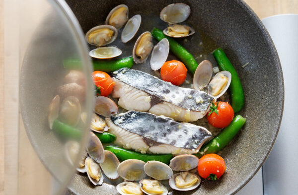 酒、アサリ、スナップエンドウ、ミニトマトを加える。フタをして、アサリの口が開くまで中火で蒸し焼きにする。