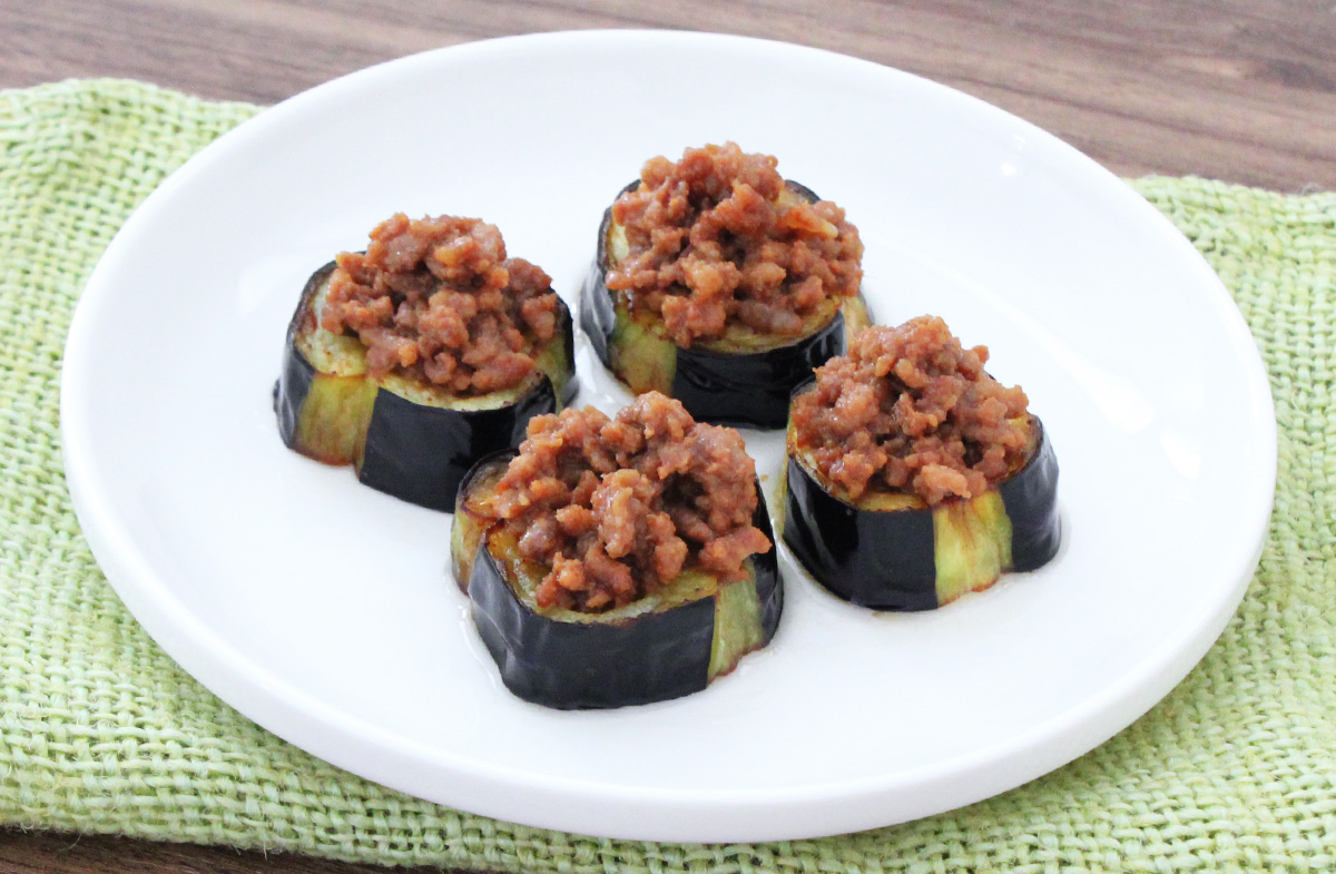 器になすを盛りつけ、肉みそをのせる。