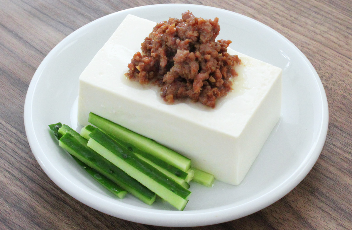 水気を切った豆腐の上に、肉みそをのせる。